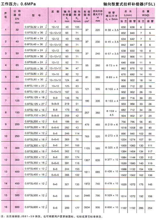 軸向型復(fù)式拉桿波紋補(bǔ)償器(FSL型)主要吸收管道的軸向位移,復(fù)式即軸向型內(nèi)壓波紋補(bǔ)償器的復(fù)數(shù),其特點(diǎn)是補(bǔ)償量大、結(jié)構(gòu)簡(jiǎn)單。一般使用于低疲勞次數(shù),需大補(bǔ)償量的管線。軸向型拉桿波紋膨脹節(jié)是由金屬波紋管,接管,導(dǎo)流筒,法蘭和拉桿結(jié)構(gòu)組成。