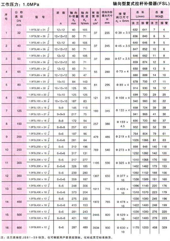 軸向型復(fù)式拉桿波紋補(bǔ)償器(FSL型)結(jié)構(gòu)簡(jiǎn)單,補(bǔ)償量大,一般使用于低疲勞次數(shù),需大補(bǔ)償量的管線。